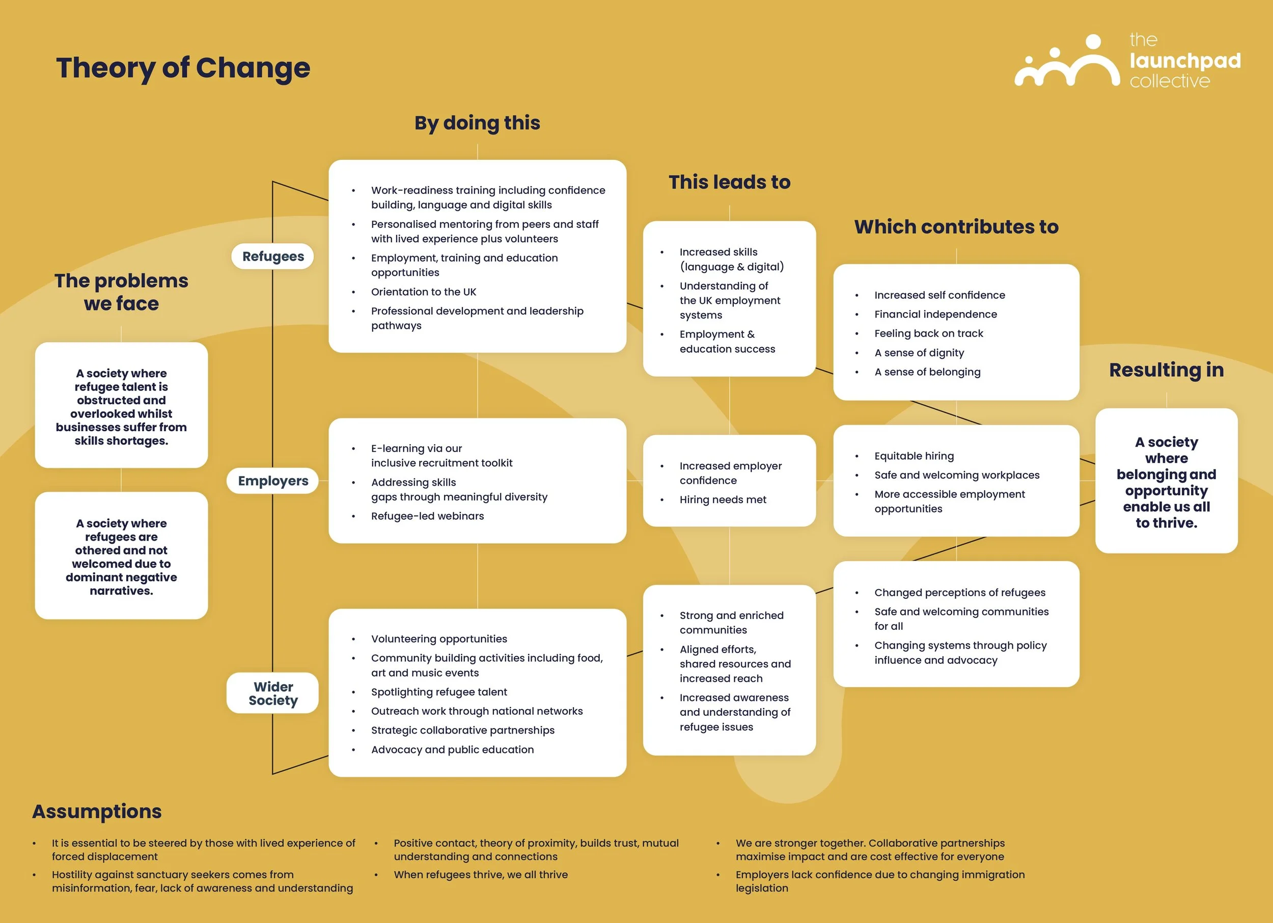 We know that to bring about change, we need a keen focus and a tight strategy. Every intervention has to serve our bigger vision for refugees and must deliver measurable outputs and results. Our theory of change maps our plan, keeping our attention sharp and our resources properly channelled. We will always be learning, so it will continue to evolve as we adapt and grow.